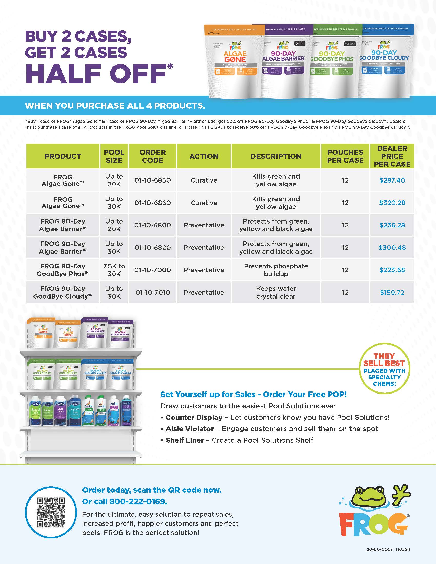 Launch offer: Buy 1 case of FROG Algae Gone™ & 1 case of FROG 90-Day Algae Barrier™ – either size; get 50% off FROG 90-Day GoodBye Phos™ & FROG 90-Day GoodBye™ Cloudy. Dealers must purchase 1 case of all 4 products in the FROG Pool Solutions line, or 1 case of all 6 SKUs to get 50% off FROG 90-Day GoodBye Phos and FROG 90-Day GoodBye Cloudy.